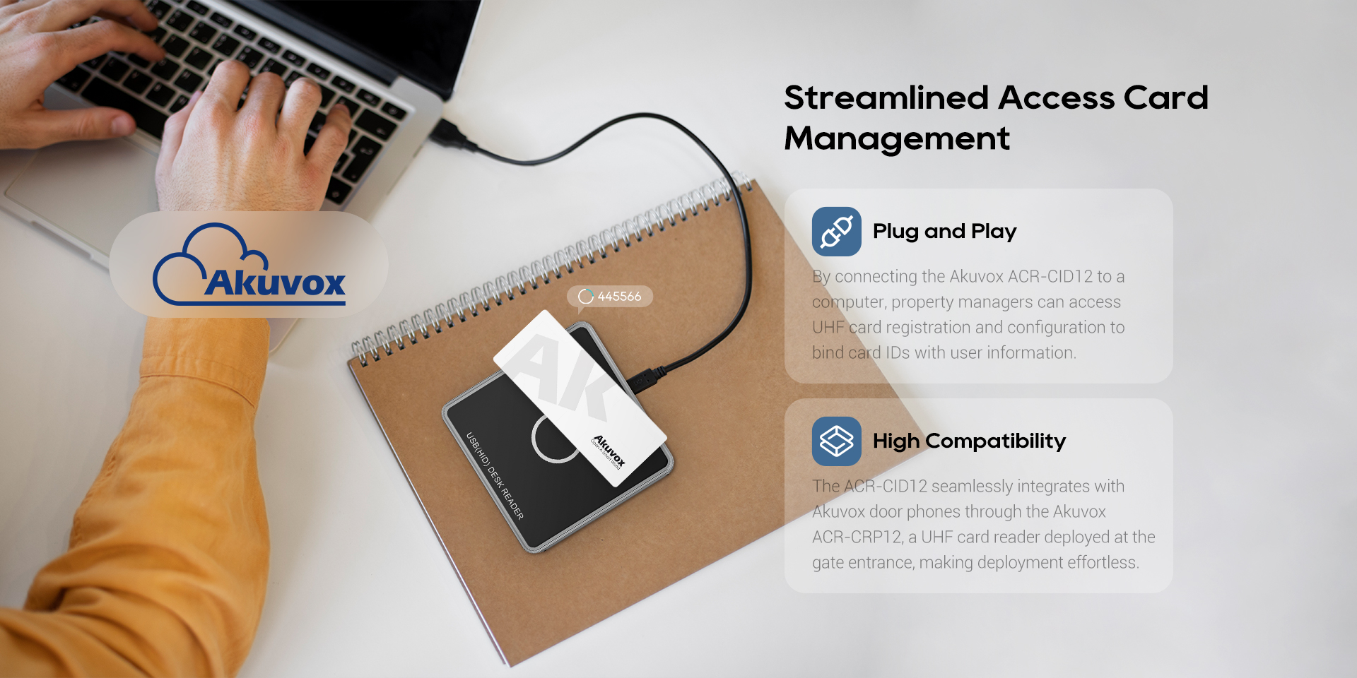 Akuvox’s ACR-CID12 is a contactless ultra-high frequency desktop card reader. It features a USB plug-and-play design, offering high integration, robust anti-interference capabilities, compact size, and more stable performance.It supports connection to a computer via a USB interface to quickly read information on ultra-high frequency access cards.